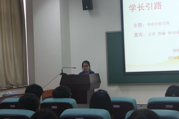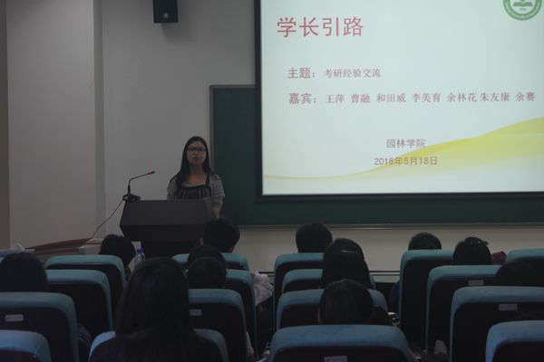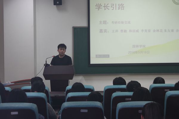 2016年5月18日下午3点在园林楼101报告厅,园林学院经过备战考研成功的学姐学长回校为大家分享了考研的经历,交流了考研路上的经验。受邀参加本次会议的包括成功考取北京林业大学研究生的李美育、和田威、以及考取中国林业科学院的王萍、和报考其他类的曹融、余赛、朱友康等学长。园林学院辅导员老师满晓晶,以及大一、大二、大三有意愿考研的学子们参加了本次会议。