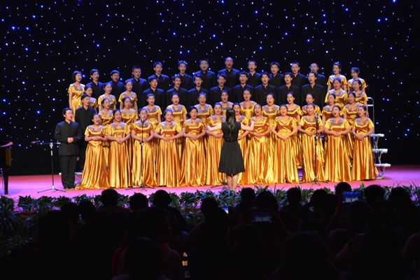 园林学院合唱队由53名园林学子组成,所有女生身着金色长裙,男生则身着黑色中山装。他们一个个面带微笑,意气风发、神采飞扬,跟随着指挥,在悠扬的伴奏下完美合唱了《天亮之前》和《绿色的希望》这两首歌曲。