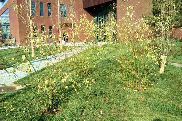 除了利用自然植物的交相辉映与四季变化,景观设计还充分利用了原有的现代建筑材料。在紧挨着楼房一层的大片玻璃窗外,成列种植了观花矮乔木,使得真花在前,镜中花影在后,产生了虚实相应的视觉感受。