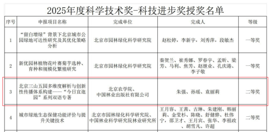 近日,2025年度北京园林学会科学技术奖评选结果正式揭晓,由北京农学院牵头完成、中国林业出版社有限公司出版发行的“北京三山五园多维度解析与创新性传播体系构建——‘今日宜逛园’系列双语专著”项目凭借突出的学术创新、显著的应用成效,荣获科技进步奖二等奖。这一荣誉既是对项目团队在园林文化研究与传播领域辛勤付出的肯定,也是学校助力首都园林绿化高质量发展、推动历史文化遗产活化传承的重要成果。